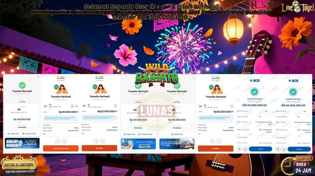 Selamat kepada User ID : u***8 telah berhasil mendapatkan kemenangan besar pada permainan Slot Provider “Wild Bandito” sebesar Rp. 300,000,000,-